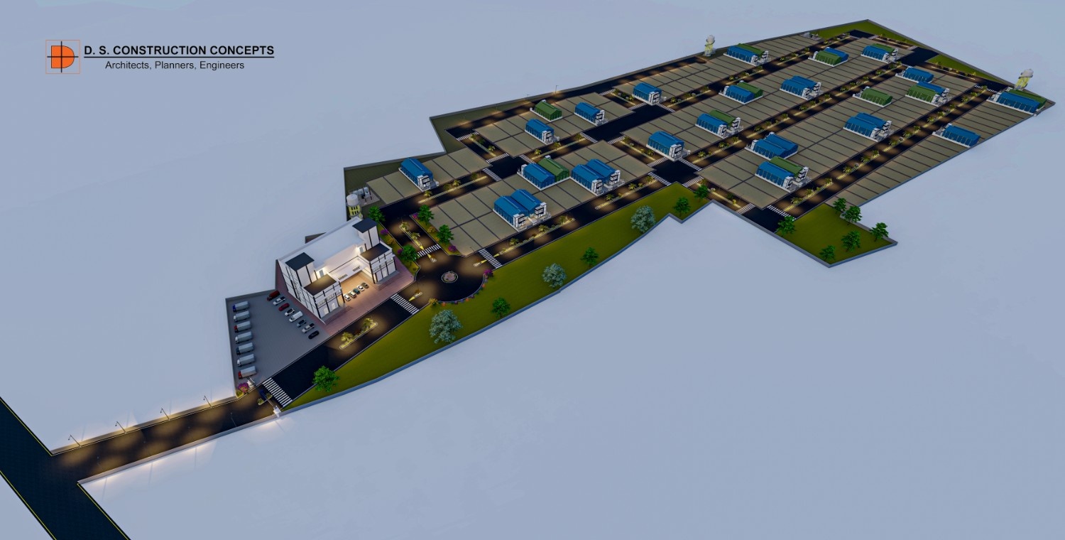 Total site area 603 Acer and Built-up area 145650 Sq. mt. G+2 RCC Frame Structures with industrial Estate development or Mega Food Park and Agro-Processing clusters with various establishment at all sites including weigh bridge, site boundary, Admin block with lab and training areas, Commercial/convenient shopping blocks, Warehouses, Silos, Grading and sortex, Workshop, Fire station, Fuel station are all required site development and Bul Services.