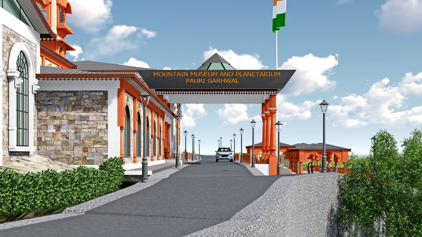 G+3 R.C.C. framed Structure Mountain Museum & Planetarium at Pauri having total built-up Area 5100 Sq mt on 1 Hectare land area comprising of Museum galleries, visitors’ orientation area, cafeteria, kitchen, sunset view point and dining area, Planetarium, Space gallery, Public Utility and site development.